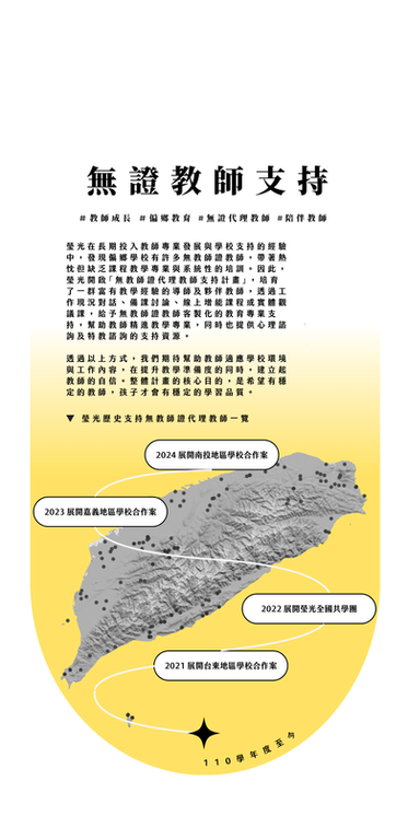 2017年,一群來自各自崗位的老師,因為看見現行體制下學校與教師在支持學生學習與實踐教育理想上的困境,他們走出了自己的教室。2019年,意識到需要一個長期穩定的系統來支持教學現場的改變,正式成立「瑩光教育協會」。